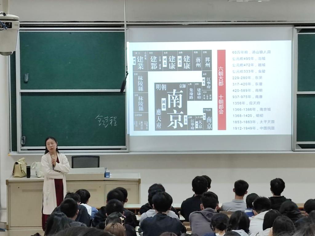 吴芙蓉老师从南京美食讲起,通过介绍南京小吃与特色菜勾起了同学们对于“玩南京”的向往。随后,吴芙蓉老师从“历史中的南京”、“山水中的南京”、“文学中的南京”三个主题让同学们了解南京悠久的历史,从南京的山到南京的湖,让同学们领略南京的好山好水,从成语到文学著作,使同学们感受南京浓厚的文化底蕴。