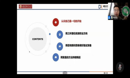人力资源专业09级毕业生、南京德锐企业管理咨询有限公司的合伙人、项目总监、产品总监李志华通过腾讯会议作了题为“赢在起点”的南财就业讲堂线上讲座。讲座由澳门百利宫