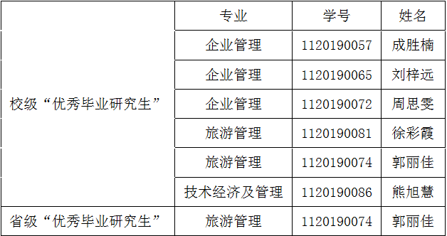 根据党委研究生工作部《关于开展2022年校、省级“优秀毕业研究生”评选工作的通知》,澳门百利宫 研究生奖助评审工作领导小组对申请人进行了评议,决定推荐校级“优秀毕业研究生”候选人6人、省级“优秀毕业研究生”候选人1人,特此公示: