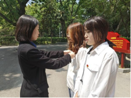 团委书记张鹏岩为2023年加入中国共青团的两位新团员颁发团章、佩戴团徽。随后,面对鲜红团旗,全体团员右手握拳,手举过肩,在张鹏岩老师的领誓下,以洪亮的声音进行了庄严宣誓。铮铮誓词既是南财学子的青春誓言,更是面对未来考验的信心和勇气。