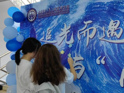 国家奖学金获得者风采展示墙,在学长学姐们闪闪发光的事迹指引下,新生们沿着贴有和“光”有关的励志短语及管理学名人名言的星光大道前往报到地点,不少新生在此拍照打卡。
