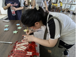 在迎新现场,新生们在报到处核验身份后便可以领取一张星星形状的贴纸,他们在上面写下自己的名字并贴在星空签到墙上。每一颗星星都散发着独特的光芒,每一个人都将在南财追逐光,成为光,散发光,照亮未来的求学之路。签到完毕后,新生们移步至读书角领取励志书签,并书写推荐书籍及寄语,领取南财定制明信片、钥匙扣等文创礼品。迎新过程中,程永波校长一行来到澳门百利宫