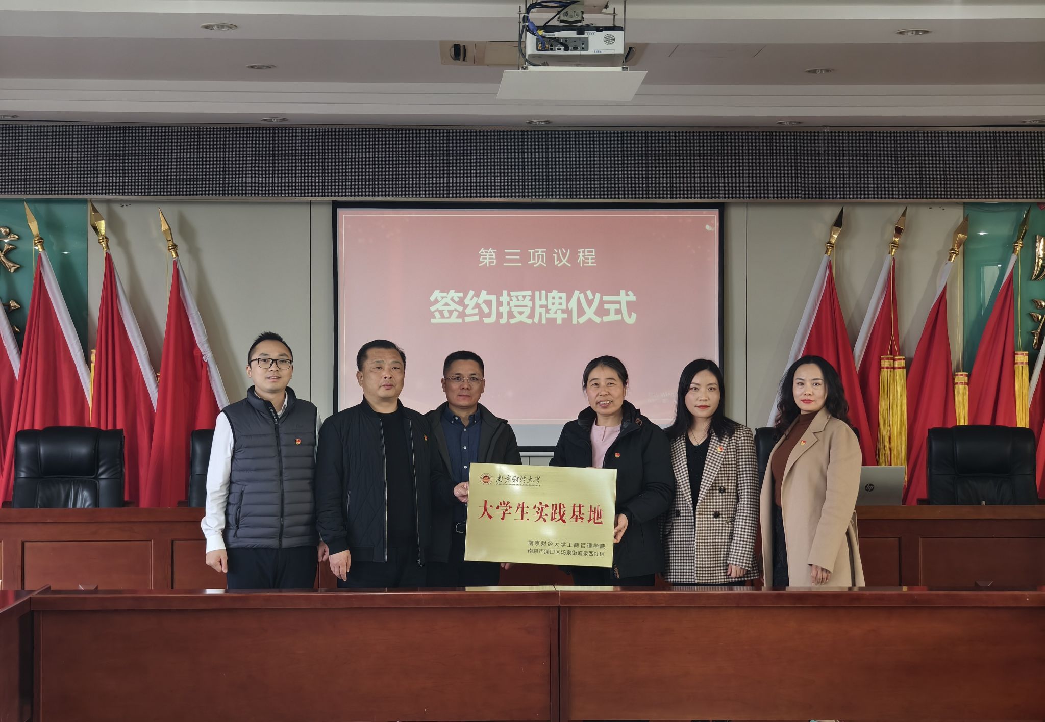 与浦口区汤泉街道泉西社区联合开展党建共建暨大学生实践基地签约揭牌活动。汤泉街道党工委副书记夏海红、汤泉街道泉西社区驻村第一书记李炜,汤泉街道泉西社区党总支书记、居委会主任陈健,澳门百利宫