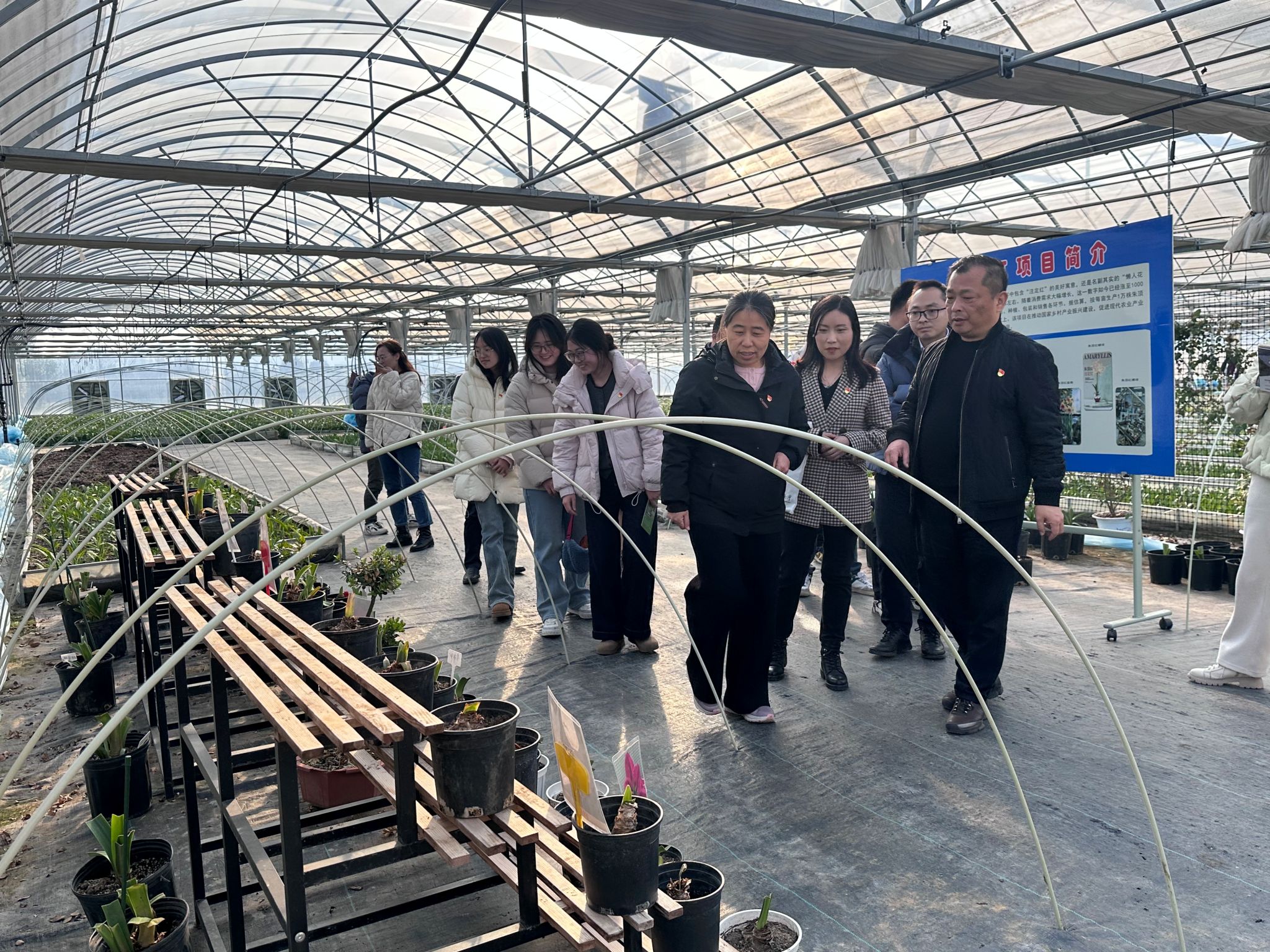 随后,师生一行走访调研映日红发展专业合作社的草花基地,实地体验花草种植的环境与流程。汤泉街道泉西社区党总支书记、居委会主任陈健以及相关生产负责人详细介绍了基地的产业规模、技术应用及市场前景。旅游管理系党支部书记何昭丽结合专业特色,提出“党建引领+农旅融合”发展建议,学生代表在实践调研中增强了对电商助农、品牌推广、劳动教育等议题的思考。