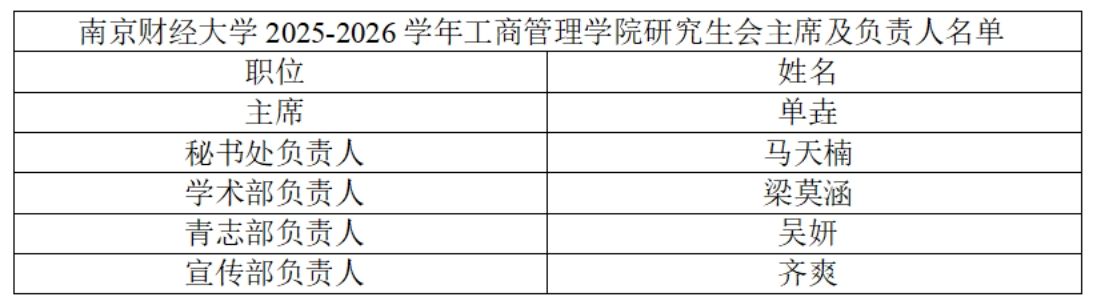 2025-2026 学年研究生会主席及各部门负责人名单如下,现予以公示。