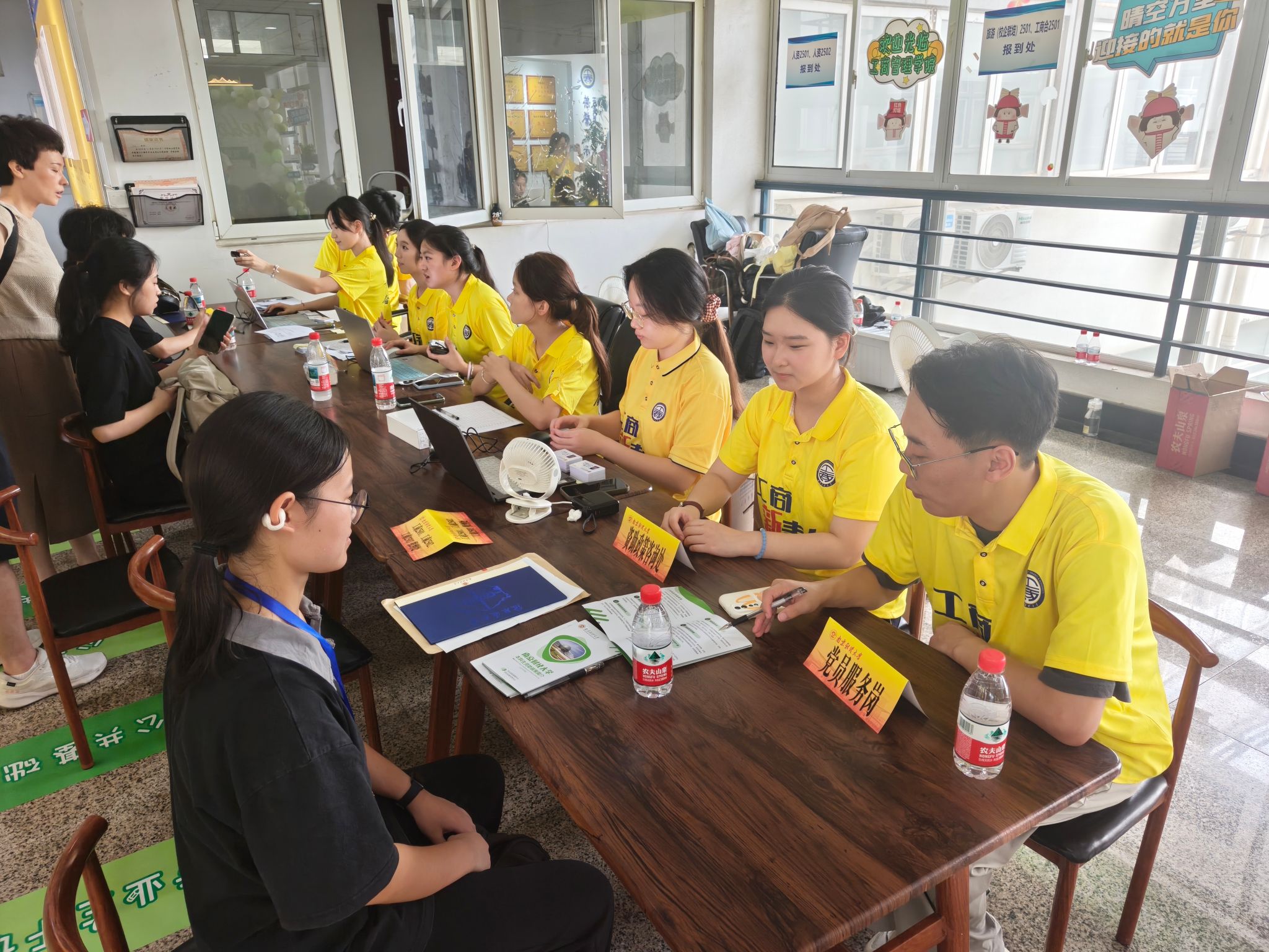 清晨起,新生陆续抵达校园,身着红色马甲的志愿者主动上前协助搬运、指引路线,宿舍楼下外场服务点也由学生党员与院学生会成员值守,为新生答疑解惑、送上暖心问候,迅速消解了新生初入校园的陌生感。德济楼“商·启新章”迎新区以各专业主干课和公共基础课名称设计地贴,引导新生抵达报到点,高效规范完成报到注册流程;“旅·阅世界”环节通过电子盲盒抽取校园主题文创礼品,激发新生对大学生活的探索兴趣;“人·成大观”拼图共创区成为迎新日的亮点。每位新生随机领取带有南财文化符号的拼图碎片,通过协作拼合成完整画卷。绿色通道与资助政策宣传同步开展,保障每位学子无忧入学。该拼图作品将在澳门百利宫