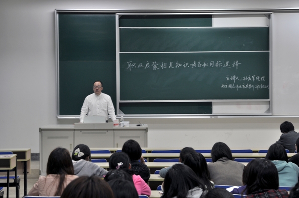 4 月 14 日 晚6:30在专4—117教室南京国泰伟业家居装饰工程有限公司的总经理孙庆军先生为工商 09 级专业的同学们作了题为“职业启蒙相关知识储备和目标选择”的学术报告。孙经理是南财 92 年企业管理专业的校友,同学们对这位“学长”倍感亲切,整个报告在轻松的氛围中进行。