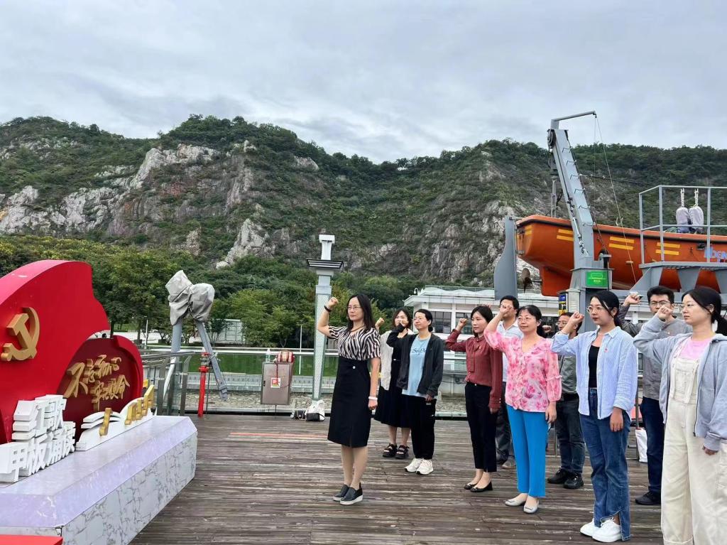 全体师生来到鼓楼区五马渡邮轮码头,集体乘坐“长江传奇”号江轮,沿途参观幕燕滨江风貌区、浦口轮渡码头、南京长江大桥、渡江胜利纪念馆、 南京下关历史陈列馆、铁路轮渡栈桥旧址、阅江楼、民国首都电厂等沿江知名人文景观和红色标志景观,在领略长江两岸城市建设风貌的同时,切实感受南京与时俱进的发展成就和文化名城的丰富内涵。在江轮上,专职党课讲师为全体党员讲授《南京长江:见证近代中国从苦难走向复兴——南京“长江传奇”党建移动红色课堂》专题党课,讲解老师通过郑和下西洋的民族巅峰时刻,第一次被迫打开国门到孙中山先生《建国大纲》的伟大构想到百万雄师过大江解放南京等发生在南京长江两岸的重大历史事件阐述了近现代中国如何挽救民族危亡、建设现代国家的血泪史、奋斗史。 随后,各支部党员在党支部书记的带领下,在甲板上面对鲜红党旗重温入党誓词,铭记入党初心,汲取奋进力量。