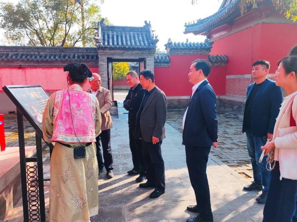 调研组首先抵达皂河龙运城,先后考察了全国重点文物保护单位“敕建安澜龙王庙”(乾隆行宫)、十里通圣商业街、大运传奇景区等功能片区。调研期间,沈思保副秘书长和王荣章副主任详细介绍了皂河龙运城项目在文旅融合方面的规划理念与运营实践,该项目是集水利文化、漕运历史与观光旅游、文博互动、餐饮商业、沉浸体验等于一体的宿迁文旅龙头项目。