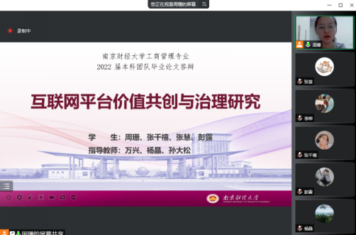本科论文团队项目的队长周珊同学从选题依据、团队合作、研究思路、主要结论与创新点五个方面进行详细汇报。周珊、张千禧、张慧与彭露四位同学合作研究的论文方向为互联网平台价值共创与治理研究,探究在平台、企业、消费者等主体共存的生态系统中,如何有效实现数据赋能与价值共创、如何应对消费者行为、如何实现企业绩效与平台治理共赢等问题。