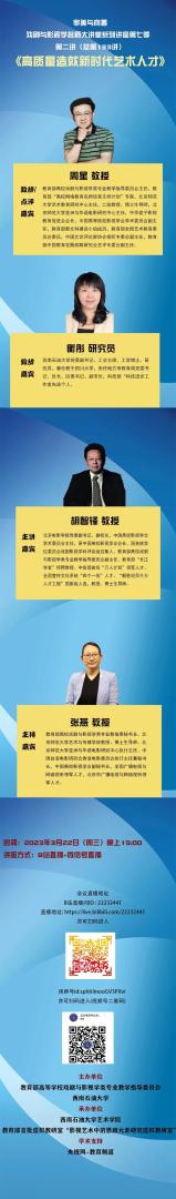 和教育部首批虚拟教研室“影视艺术中的思政元素研究虚拟教研室”共同承办,由央视网-教育频道进行学术支持。邀请到胡智锋教授就《高质量造就新时代艺术人才》一题展开精彩发言;周星教授、衡彤研究员为本次讲座致辞;张燕教授作为本次讲座主持人,最后由周星教授进行总结点评。