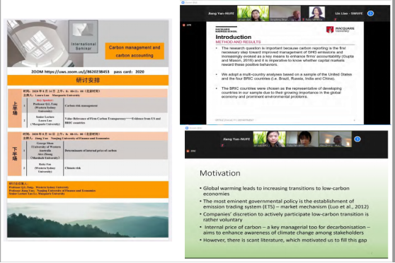 研讨会上,来自于Western Sydney University的Q.L.Tang教授作为Key Speaker做了“Carbon risk management”的主题报告。来自于Macquarie University的高级讲师Laura Luo做了“Value Relevance of Firm Carbon Transparency”的论文报告,来自于University of Western Australia的George Shan教授和Murdoch University的Alex Zhang老师做了“Determinants of internal price of carbon”的论文报告,来自于Western Sydney University的Ruby Fan博士做了“Climate risk”的文献报告。参加本次线上研讨会的还有来自于University of Sydney,University of Wollongong,Massey University,国内的华中科技大学、西南财经大学以及澳门百利宫